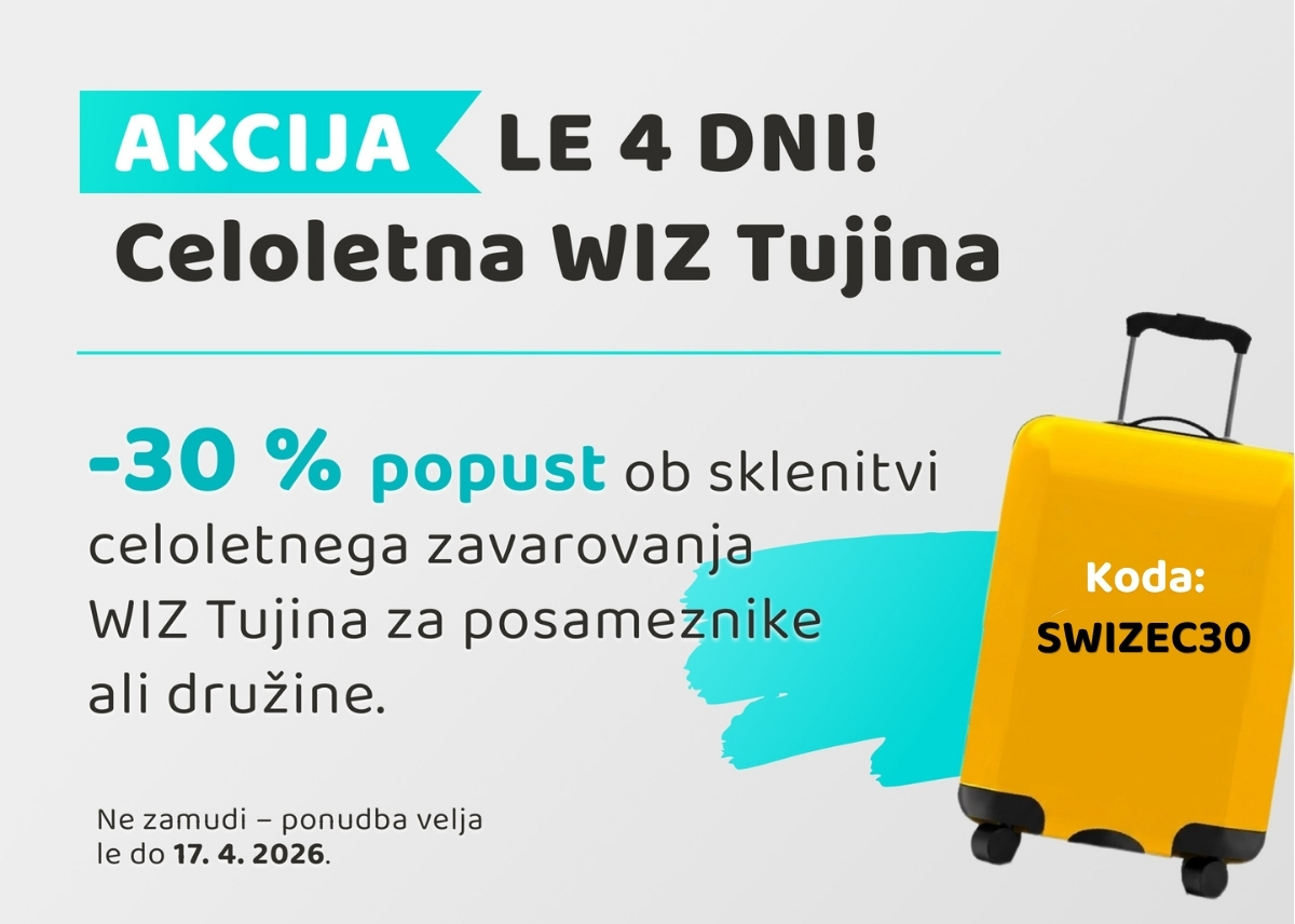 Če rad potuješ ali to šele načrtuješ, je to prava priložnost. Ob sklenitvi celoletnega zavarovanja WIZ Tujina, za posameznike ali družine, z vnosom kode SWIZEC30, prejmeš kar -30 % popust. AKCIJA TRAJA LE 4 DNI, DO 17. 4. 2026 !